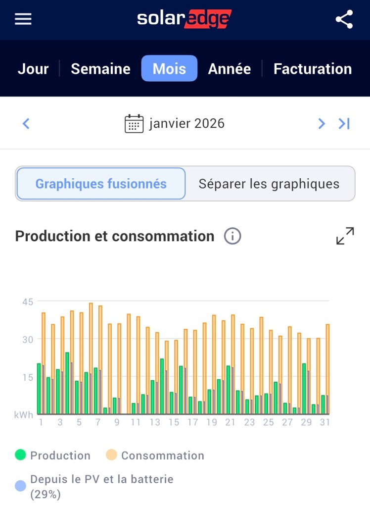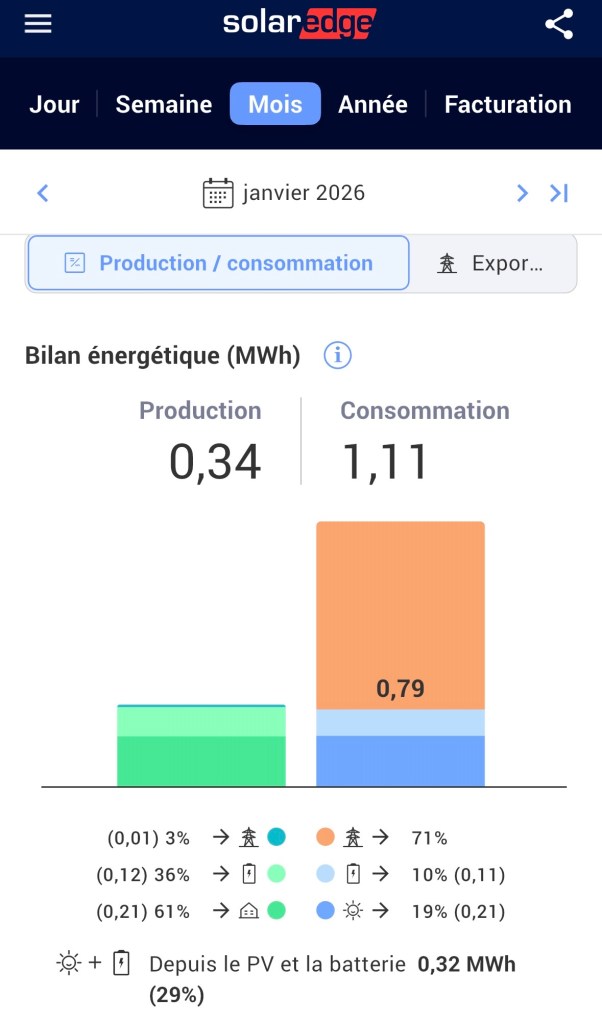 Premier mois de l’année 2026, premier bilan solaire, l’air de rien, ce n’est pas rien, nous avons produit 29% de notre consommation électrique qui a surtout été utilisée pour chauffer la maison avec la pompe à chaleur,