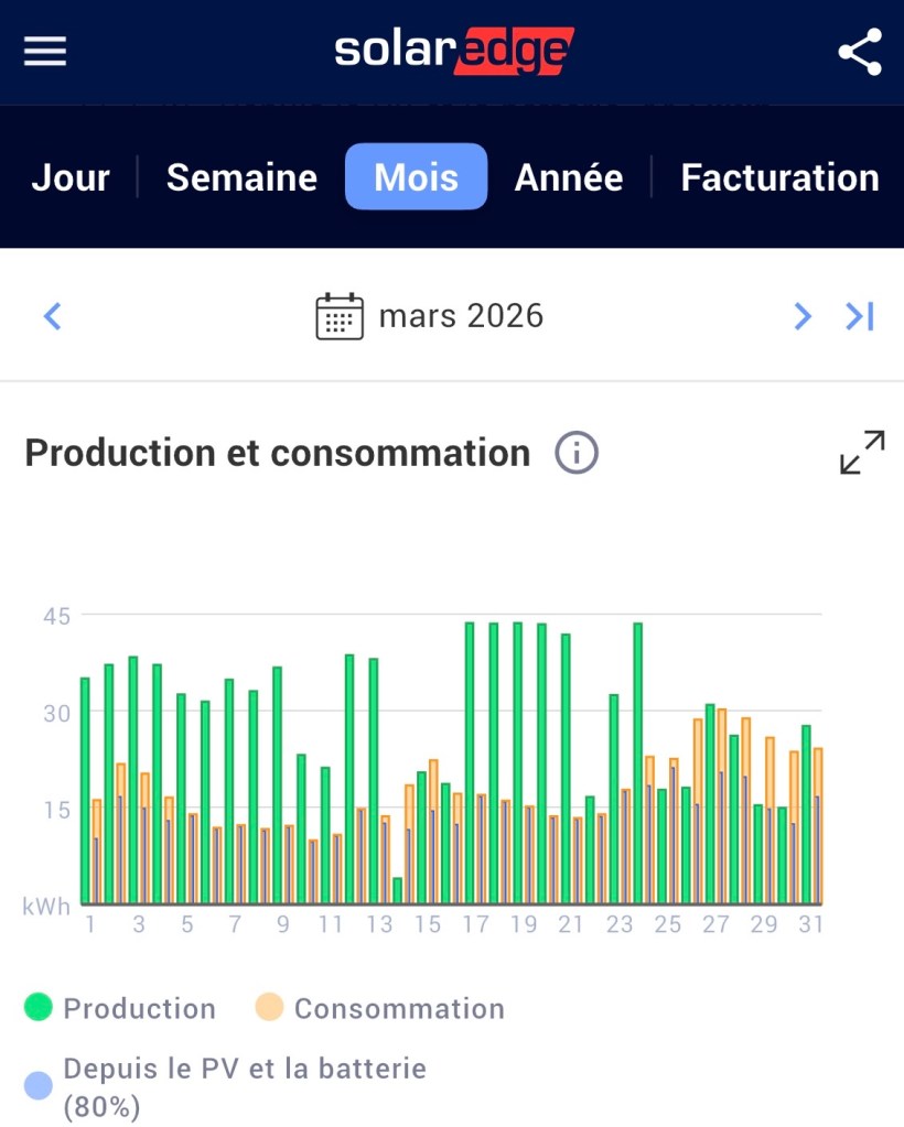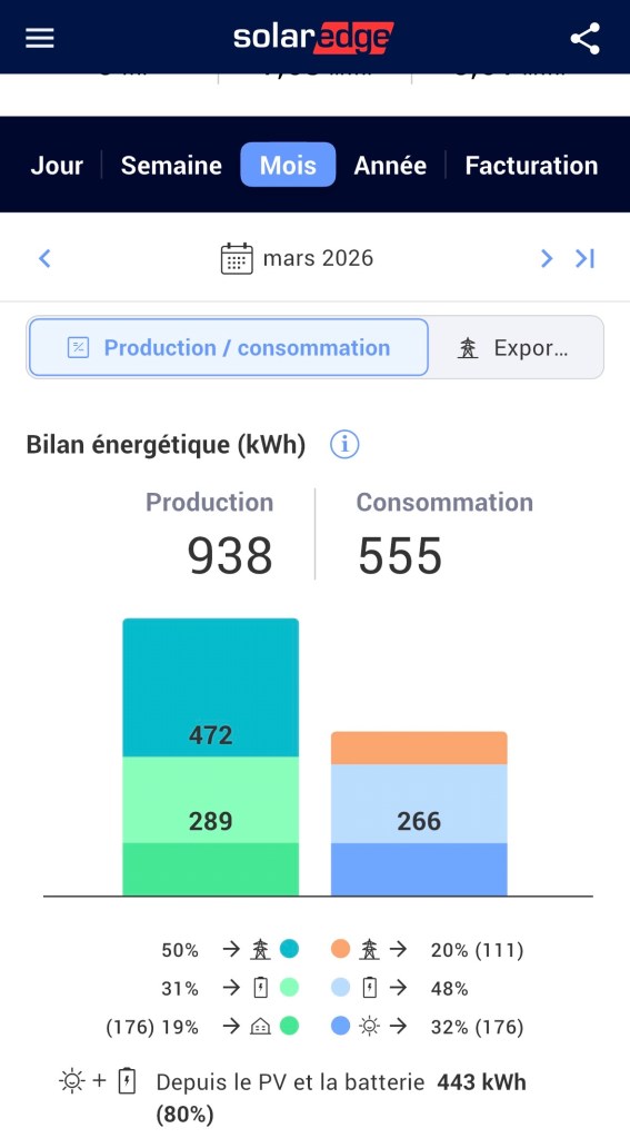 Finalement, nous avons produit bien plus de courant électrique que nous n’en avons consommé, presque le double, pourvu que ça dure en avril !