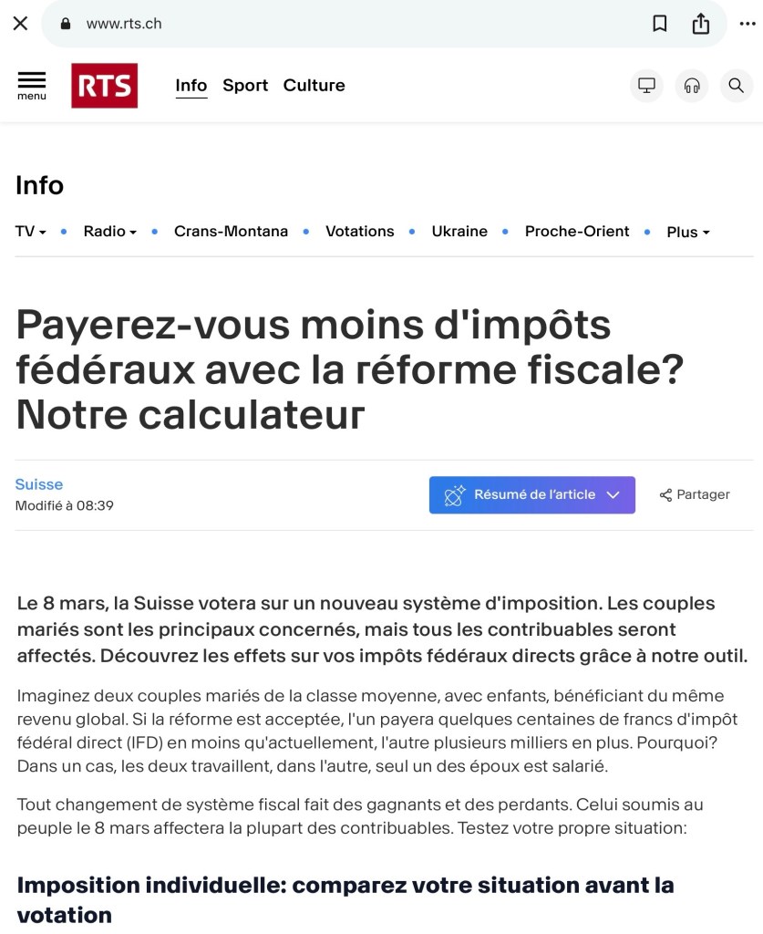 Bravo à la RTS de nous permettre de calculer nos futures pertes, mais c’est seulement pour l’IFD, donc que pour les revenus des impôts fédéraux, sans compter les impôts cantonaux et communaux qui touchent aussi les fortunes diverses à varier…